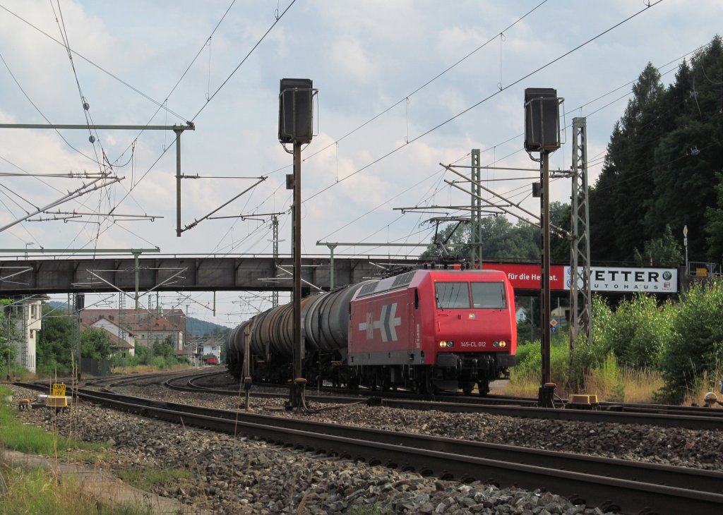 145 CL 012 der HGK zieht am 18. Juli 2012 einen Kesselwagenzug über Gleis 4 aus Kronach in Richtung Saalfeld heraus.