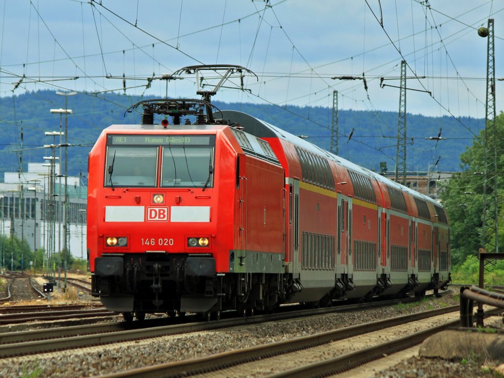 146 020 zieht am 16.07.2012 den RE1 auf der KBS 480, hier kurz hinter Aachen Rothe-Erde.