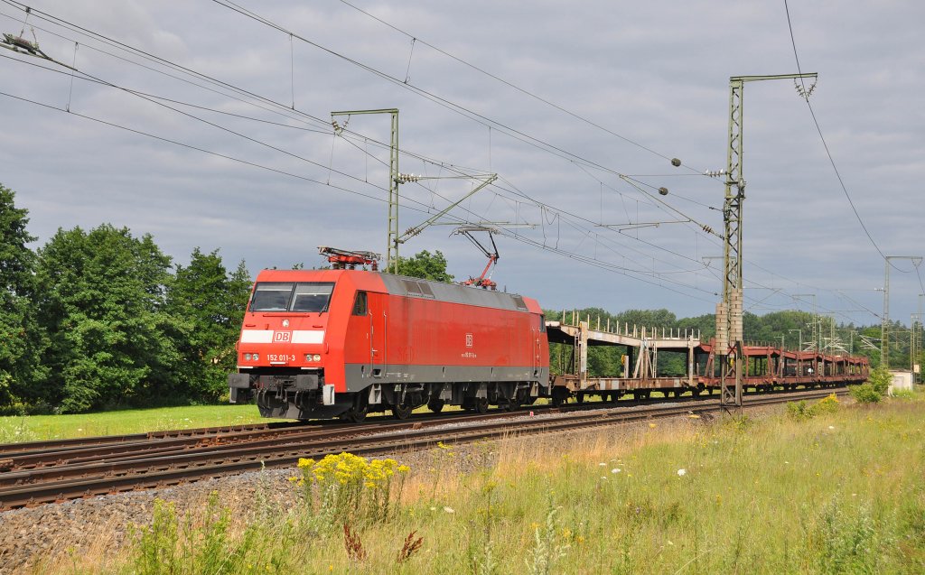 152 011 mit einer Leerwagengarnitur in Richtung Ansbach.Bild entstand in Oberdachstetten am 18.7.2012