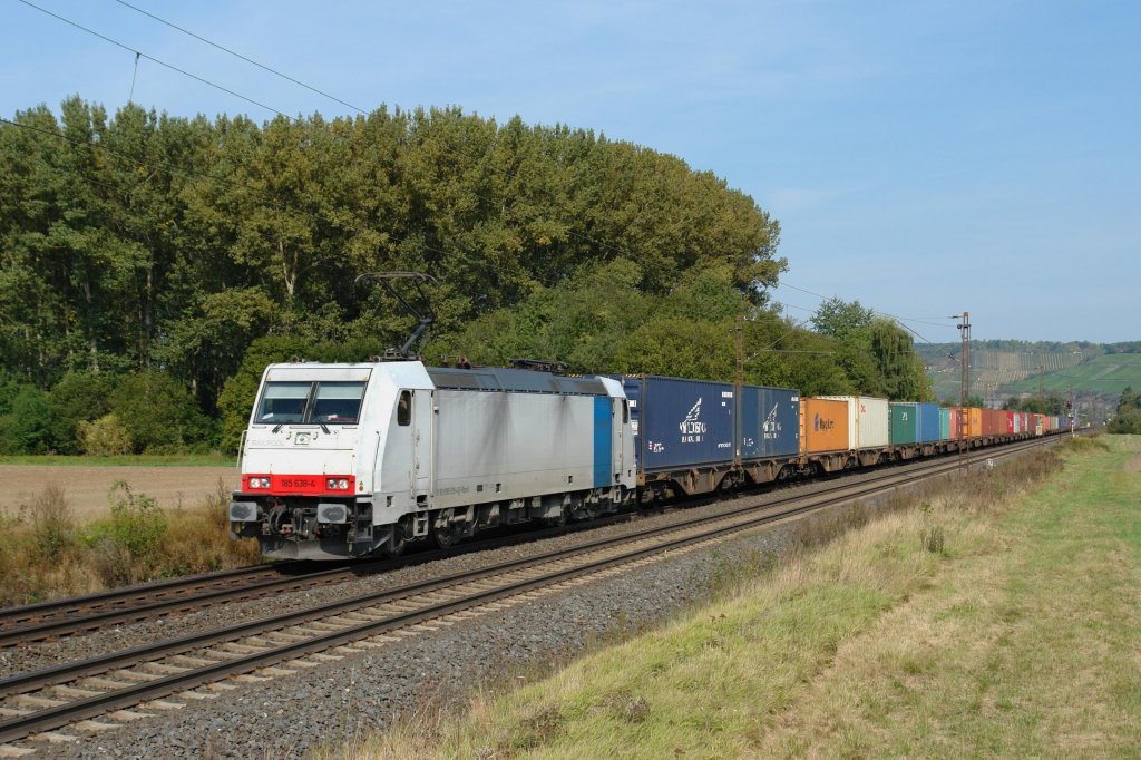 185 638 mit einem Containerzug am 24.09.2011 unterwegs bei Himmelstadt.