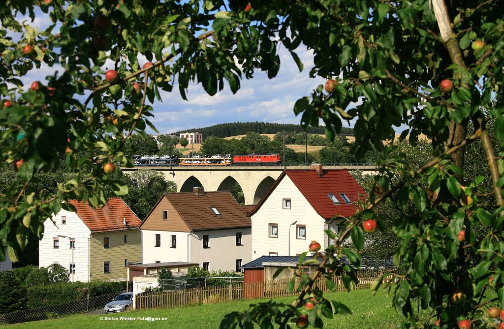 Am Abend des 19.07.2012 zog die 232 618 einen langen Güterzug mit Autos und Holz über das Viadukt in Unterkotzau. Hätte nicht gedacht, hier schon wieder Äpfel anzutreffen...