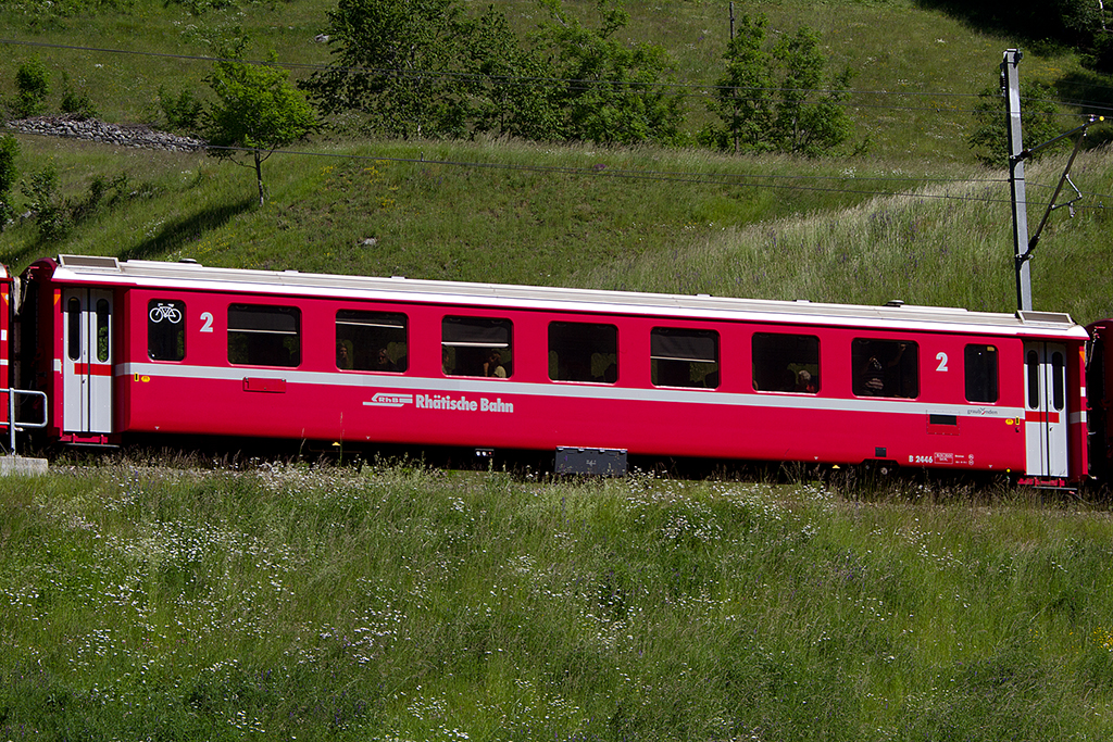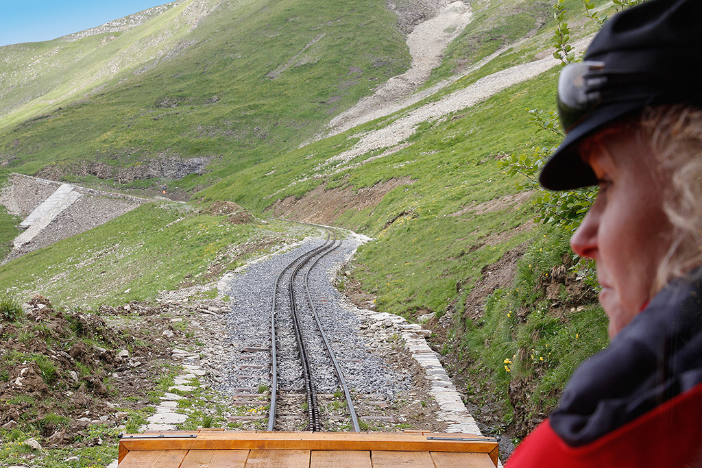 An dieser Stelle auf rund 2000 m ü. M. lag noch Ende Mai das geborstene Schienenstück. Hier musste neu geschottert und wieder ein Stück Schiene eingefügt werden. Während Bergfahrt im noblen "Salon Rouge" beobachtet Zugbegleiterin Frau Grossmann genau, was sich auf der Schiene tut. In der hohen Mauer, 16. Juli 2012, 12:15