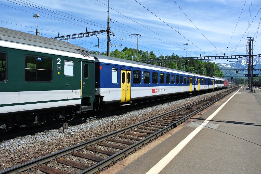 Bild 1000: Der Einsatz der EWI NPZ Regio Wagen im Fernverkehr war leider nur von kurzer Dauer. Im Bild sind 2 B EWI NPZ am IR 2173 beim Zwischenhalt in Arth-Goldau, 17.05.2012.