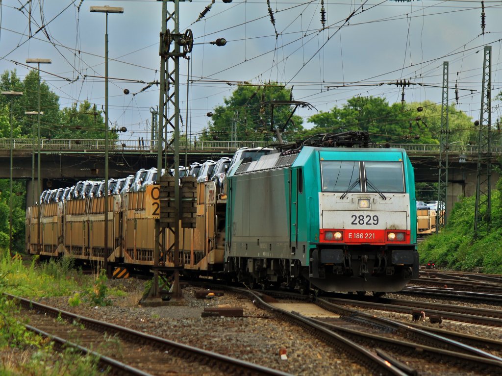 Cobra 186 221 (2829) am 17.07.2012 mit einem langen Autozug auf den letzten 200m der Montzenroute in Aachen West.
