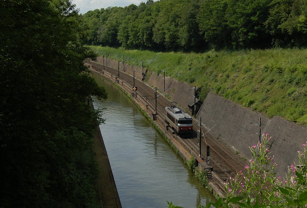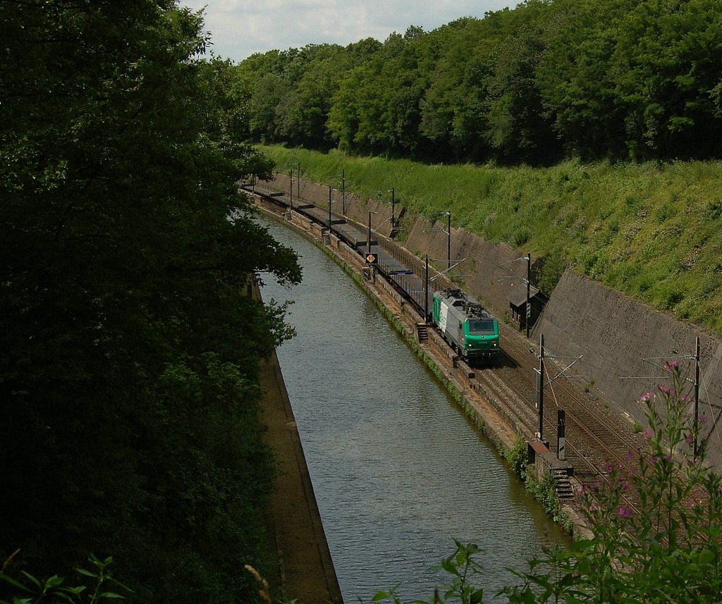 Die Fret BB 37000 zieht ihren Güterzug, zwischen Reding & Arzviller, am Rhein-Marne-Kanal entlang Richtung Saverne. 18.07.2012
