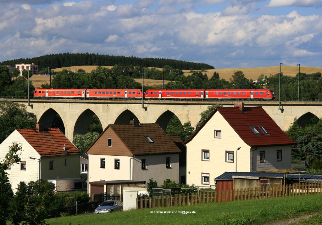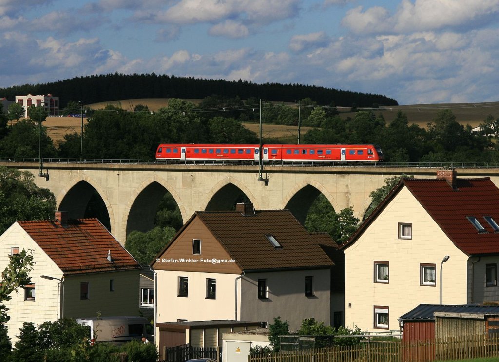 Über den Dächern von Kotzau könnte man dieses Bild betiteln. Hier fährt ein einfacher 612 über den Saaleviadukt von Unterkotzau bei Hof und zeigt sich im Abendlicht des 19.07.2012