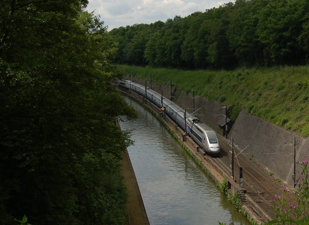 Ein TGV POS fährt am Rhein-Marne-Kanal, zwischen Reding & Arzviller, seinem nächsten Halt Strasbourg entgegen. 18.07.2012