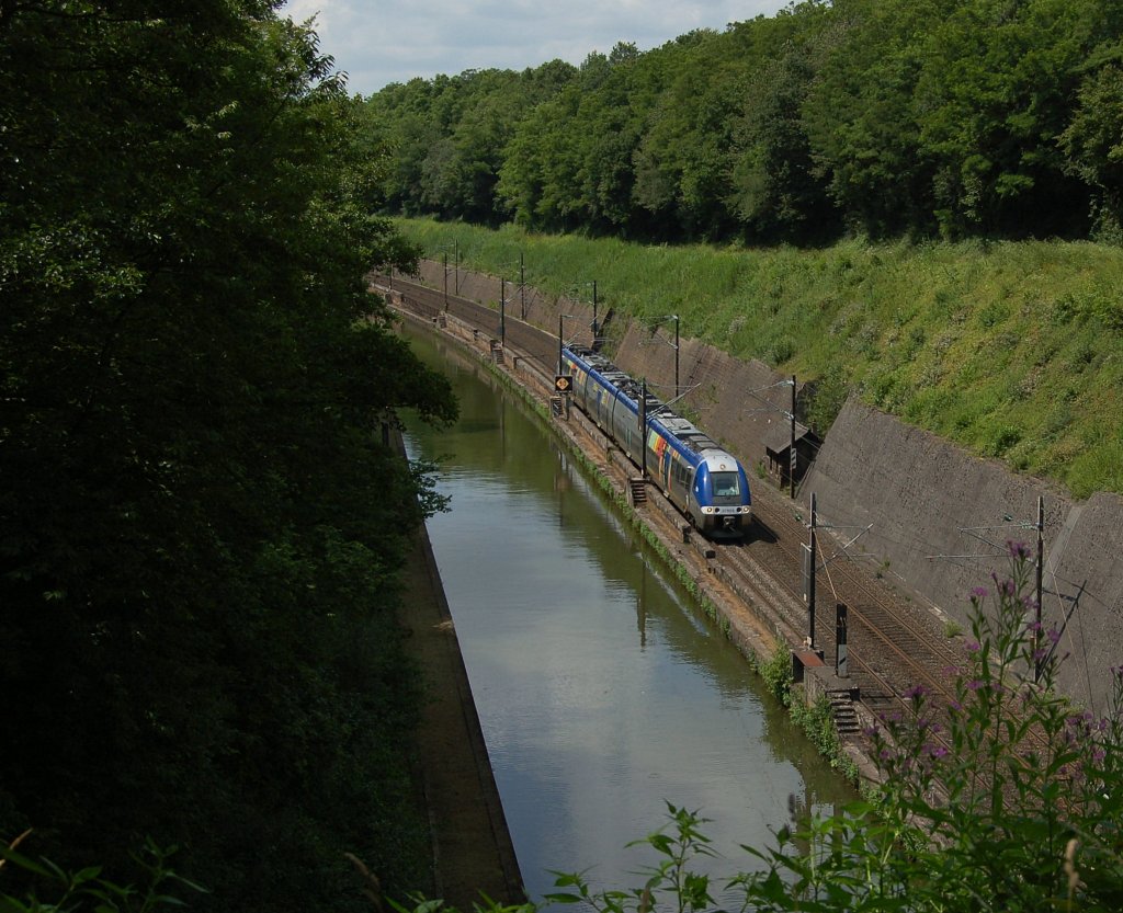 Ein Z 27500 der SNCF als RE 30305, Metz Ville - Strasbourg, fährt zwischen Reding & Arzviller (kein Halt) am Rhein-Marne-Kanal entlang und wird bald den nächsten Halt Lutzelbourg erreichen. 18.07.2012