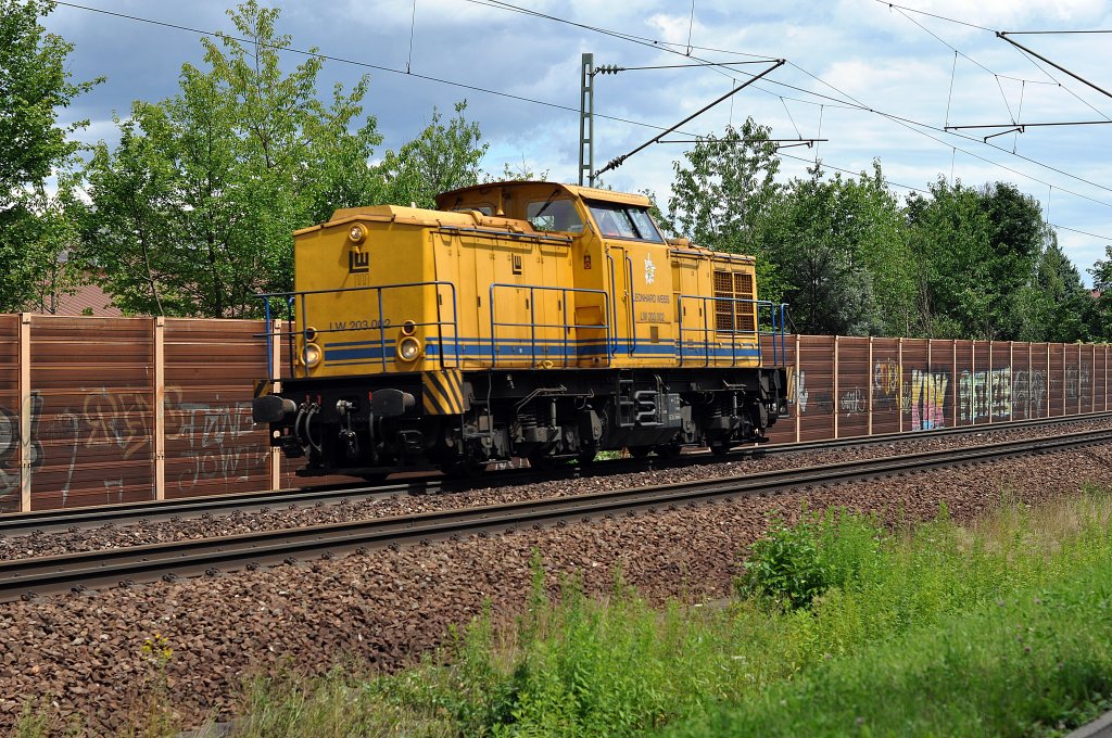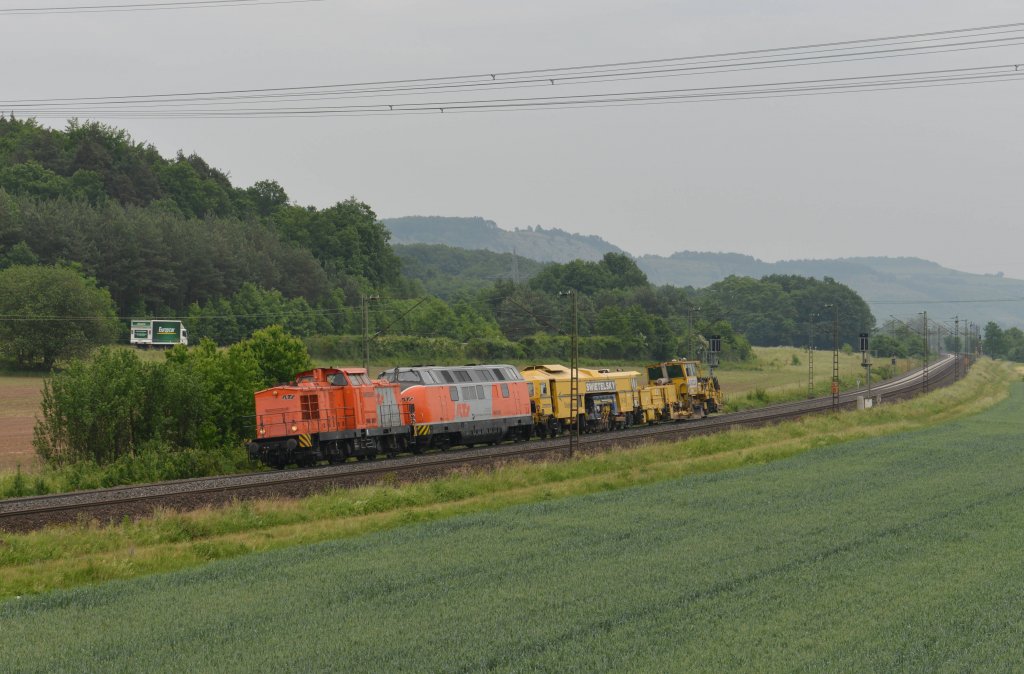 Eine Br 203 und eine V 200 mit einer Stopfmaschine am 02.06.2012 unterwegs bei Harrbach.