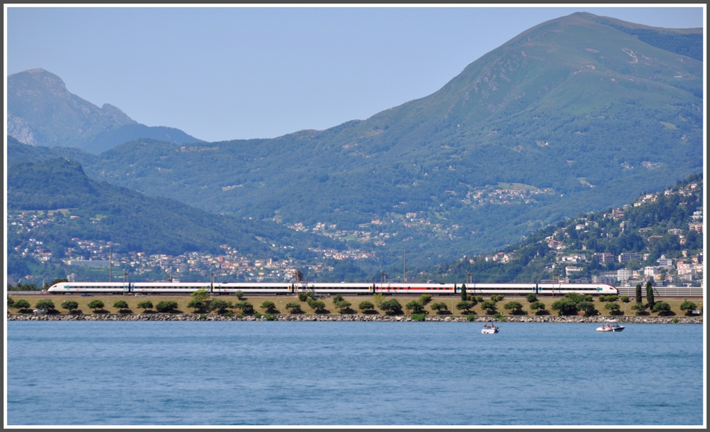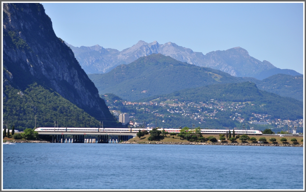 ICN als Ersatzzug für den EC20 auf dem Damm von Melide. Durch die Öffnung fährt auch unser Kursschiff auf dem Weg von Capolago Riva San Vitale nach Lugano. (16.07.2012)