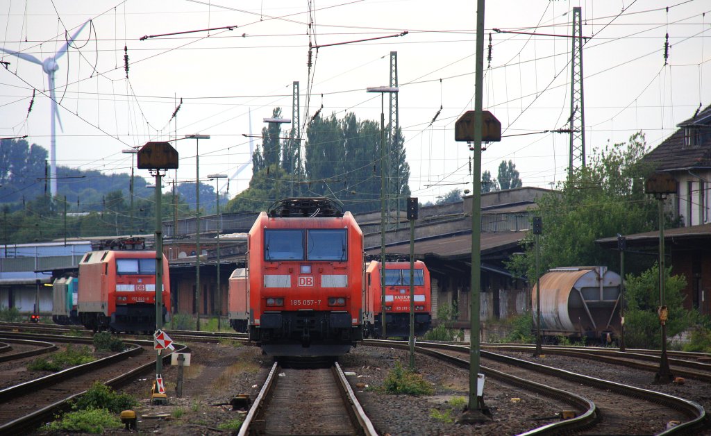 Im Vordergrund sieht man 185 057-7 DB, rechts daneben weiter hinten steht 185 281-3 von Railion und auf der Linken ist 152 023-8 DB in Aachen-West bei schöner Abendstimmung am 18.7.2012.