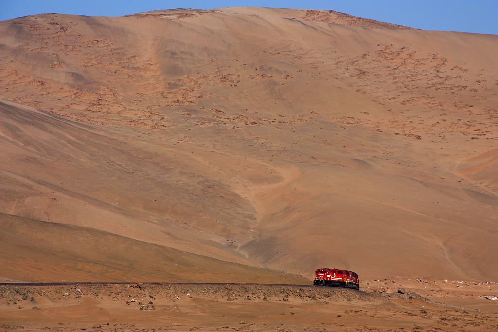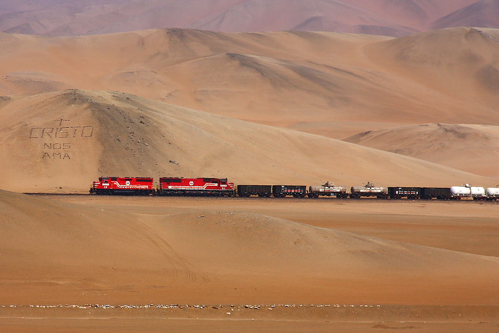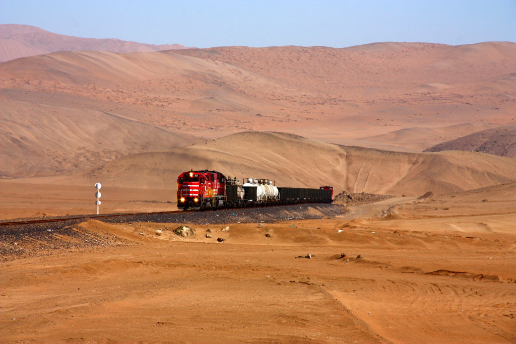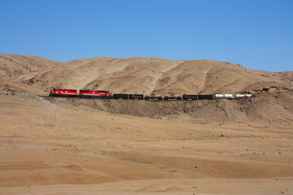 SPCC (Ilo-Toquepala) No. 32 (EMD GP40-2) führt zusammen mit No. 61 (EMD SD70) einen Zug mit Versorgungsgütern für die Minen in über 3000m Höhe sowie leeren Erzwagen bergwärts // 29.08.2011