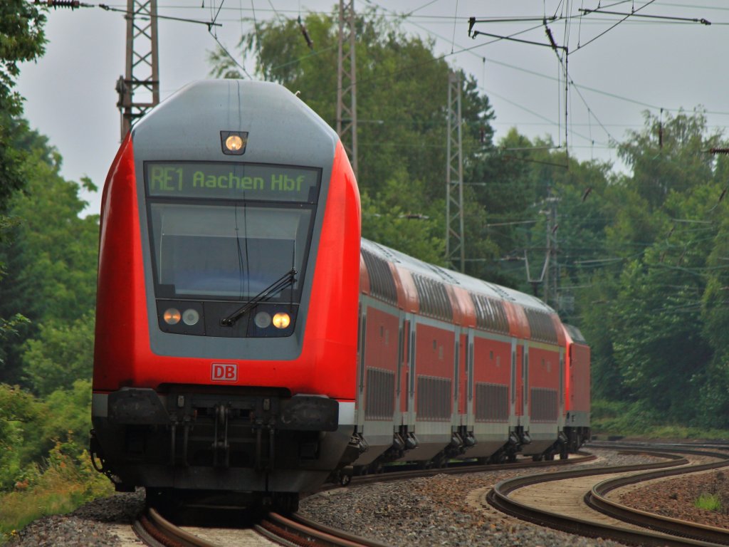 RE 1 mit Steuerwagen voraus, am 16.07.2012 geschoben von 146 030 auf der KBS 480 kurz vor Eschweiler.