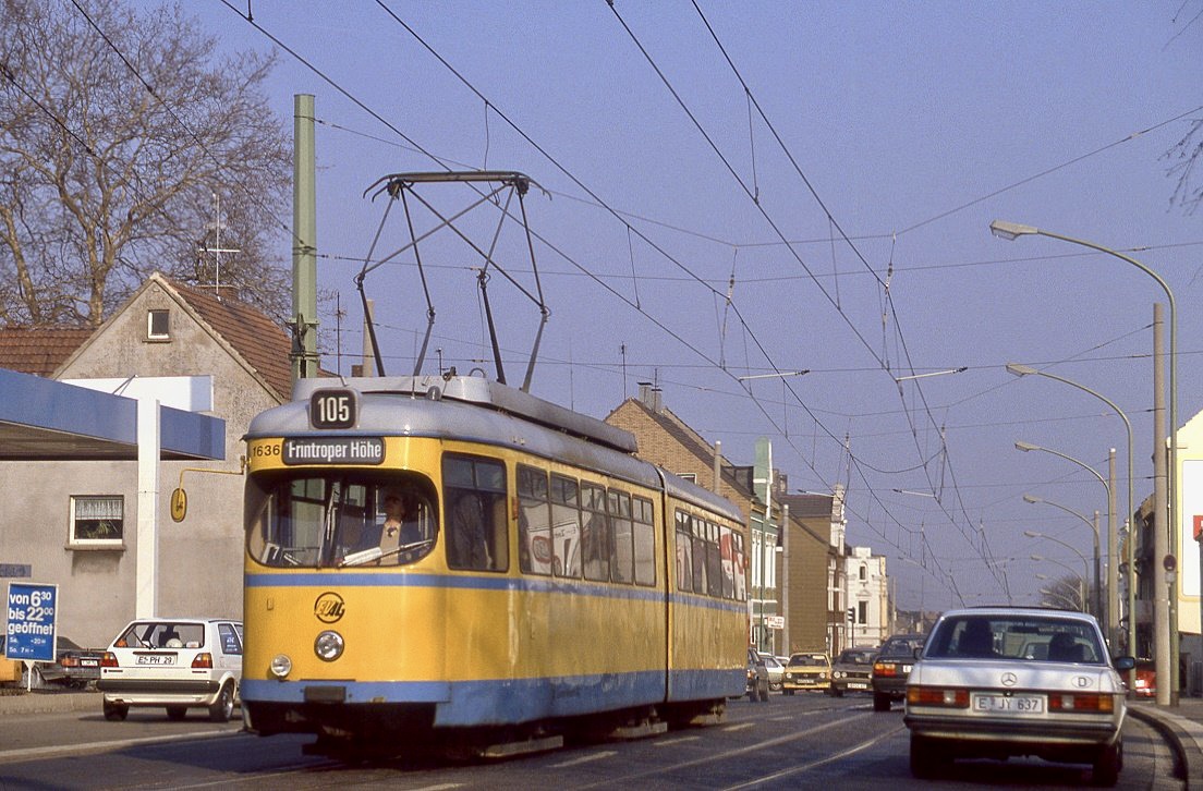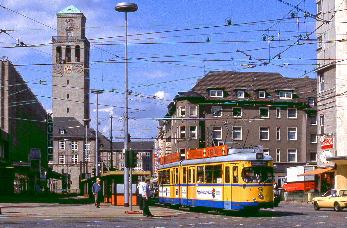 Essen Tw 1623 hat auf der damals noch durchgehend betriebenen Mischline 104 den Berliner Platz in Mülheim erreicht. Das Gleis links war normalspurig und diente den Duisburger Wagen zum Wenden mittels Blockumfahrung. Aufnahme vom 20.08.1988.