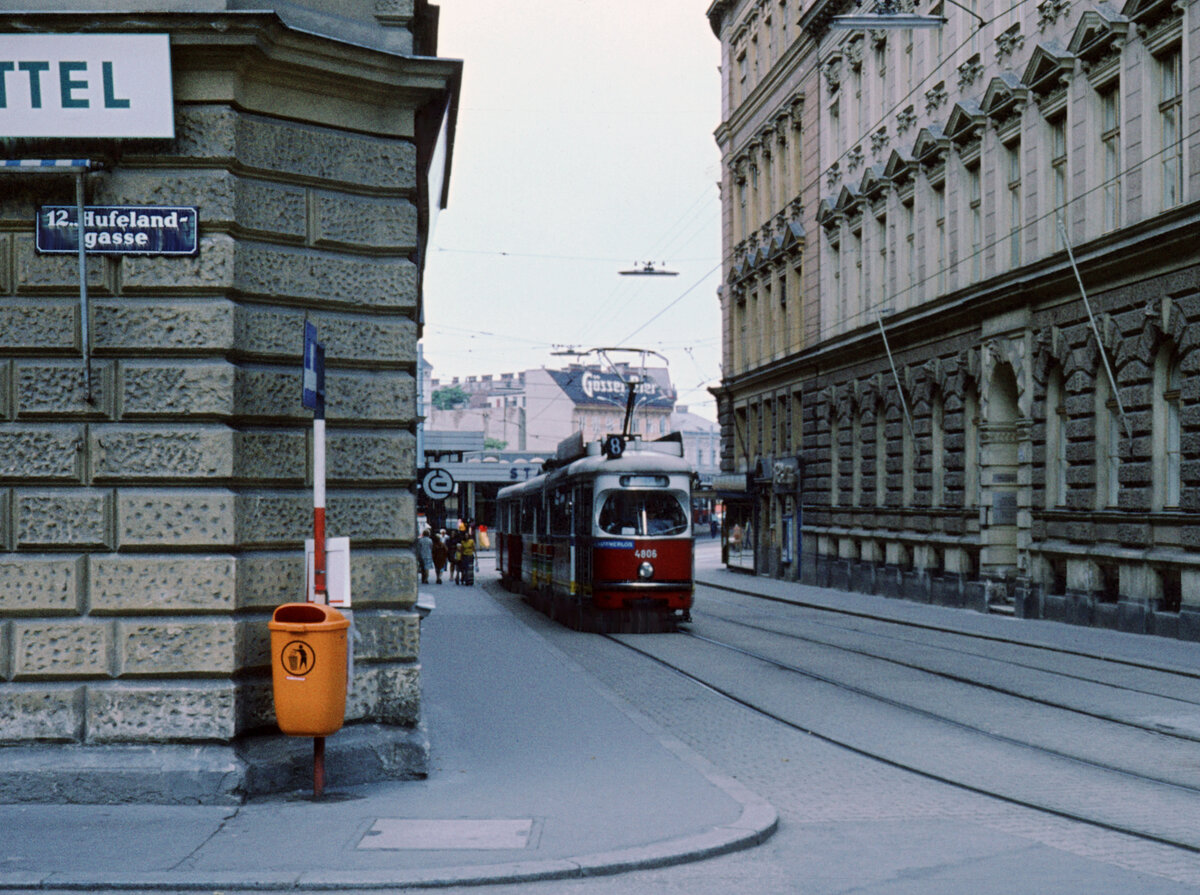 Wien Wiener Stadtwerke-Verkehrsbetriebe (WVB) SL 8 (E1 4806 (SGP 1973)) Theresienbadgasse / Hufelandgasse im Juli 1977. - Scan eines Diapositivs. Kamera: Leica CL.