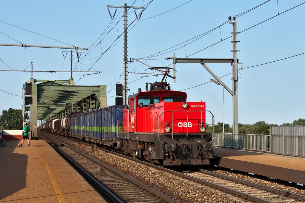 1063 031 überquert mit einem Güterzug die Donau. Wien Praterkai, am 23.07.2012.
