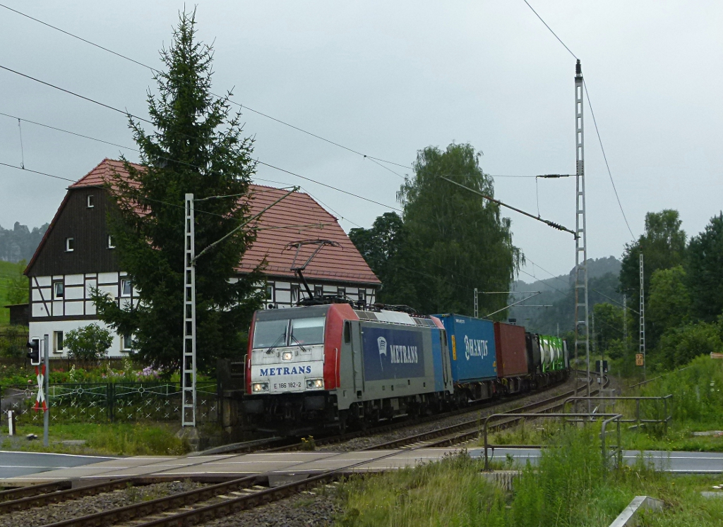 186 182-2 von Metrans ist mit einem Containerzug am 18.07.2012 in Kurort Rathen