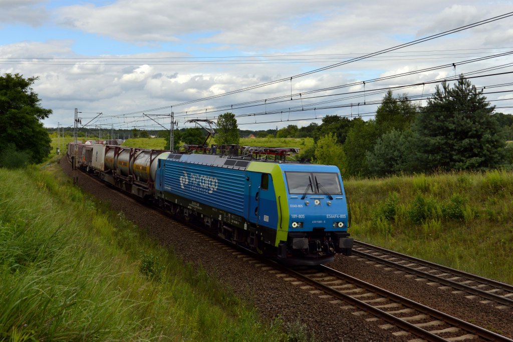 189 805 mit einem Containerzug am 20.07.2012 unterwegs bei Slubice.