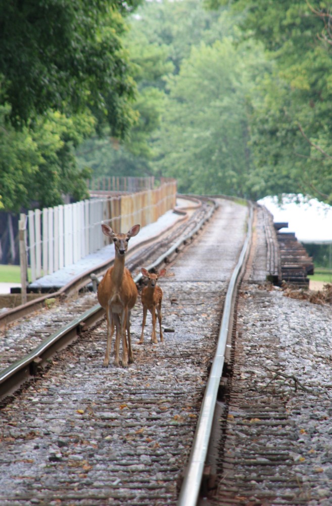 23.7.2012 Harpers Ferry, WV. Eine Reh-Familie beobachtet einen Bahnfotografen. (Und umgekehrt)