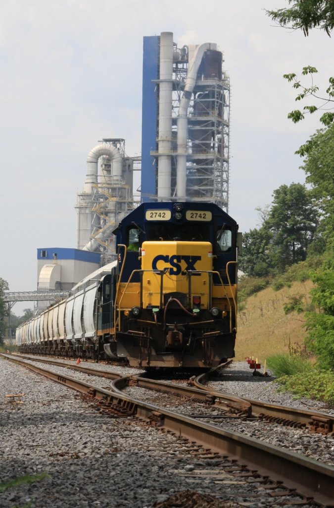 23.7.2012 Martinsburg, WV. CSX 2742 (GP 38-2) mit 6927 (GP 40-2) vor einem Ganzzug und einer Industrieanlage.