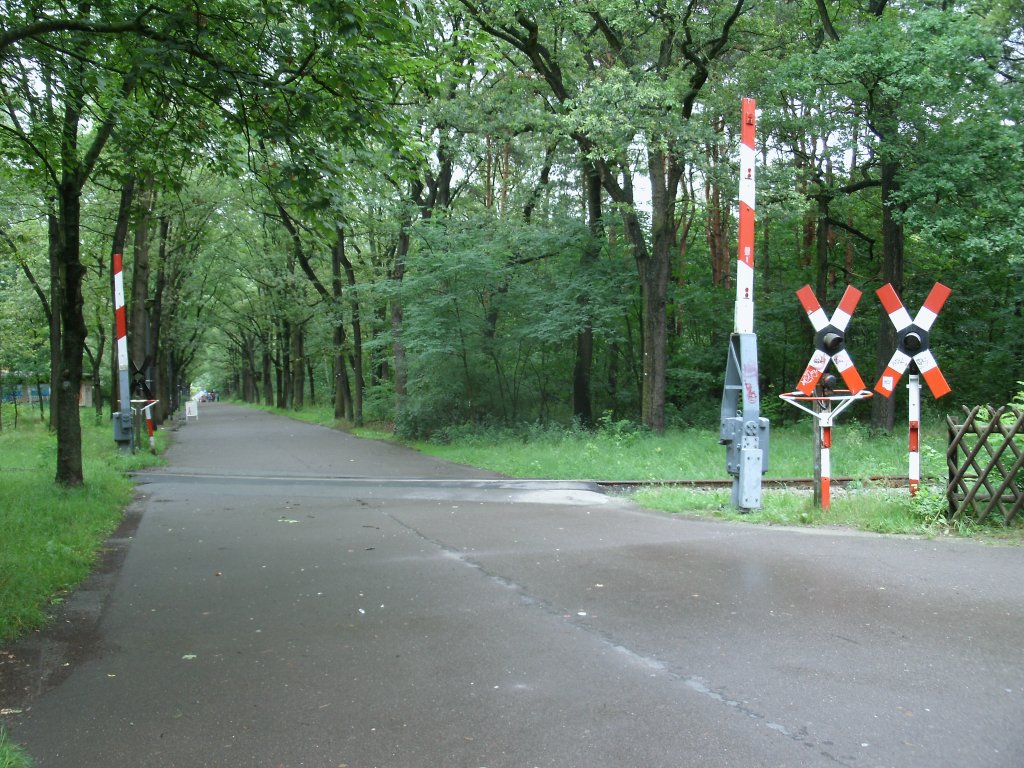 Beschrankter Bahnübergang an der Abzweigstelle "Freilichtbühne" bei der Berliner Parkeisenbahn am 14.Juli 2012.