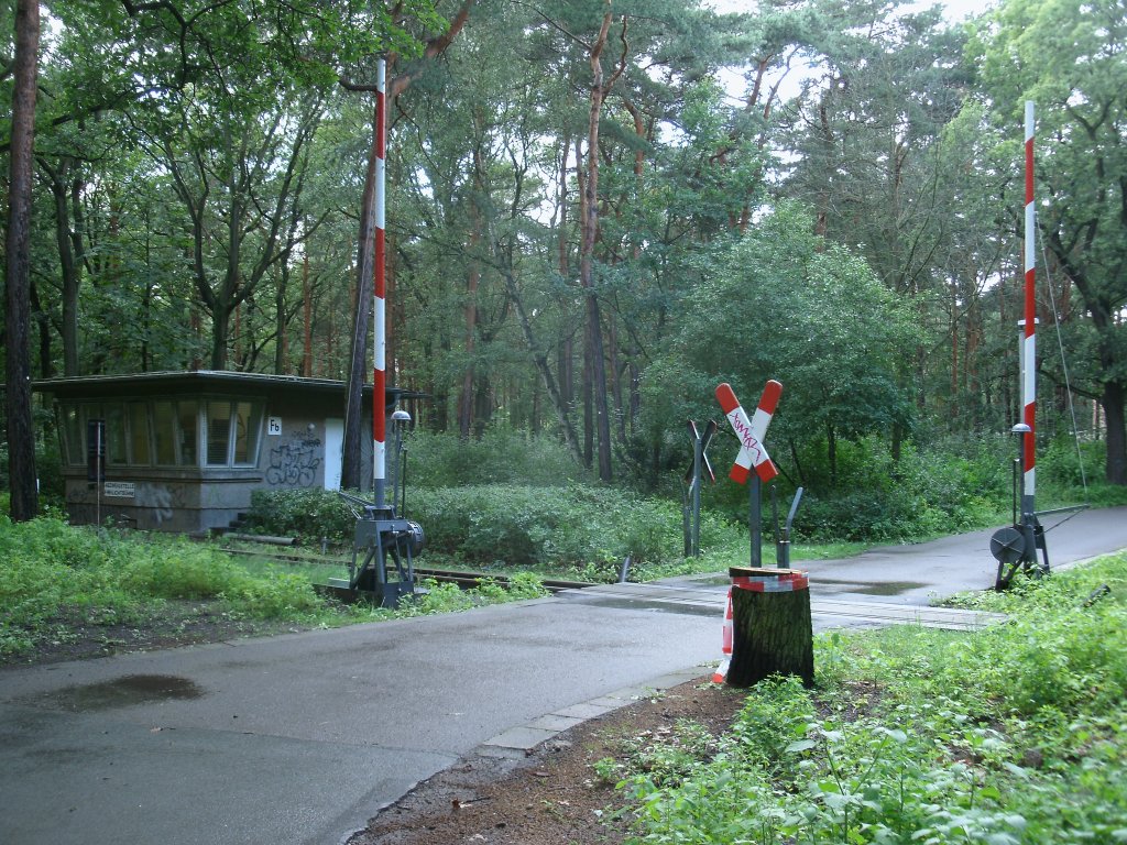 Beschrankter Bahnübergang an der Abzweigstelle  Freilichtbühne  bei der Berliner Parkeisenbahn am 14.Juli 2012.