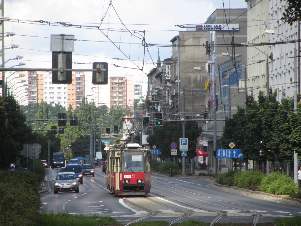 Die Tram 1045 auf der Linie 8 wartet in der Bolesława Krzywoustego auf freie Fahrt. 22.7.2012