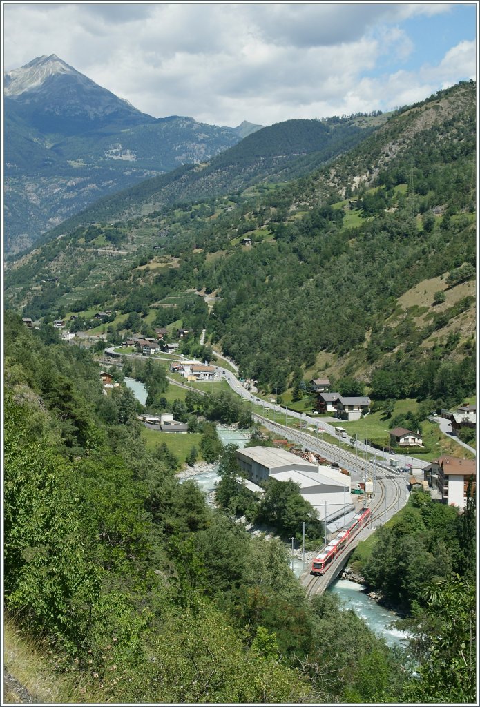 Ein "Komet" nach Zermatt erreicht, den Zahnstangenabschnitt raufschlängend, Stalden. 22. Juli 2012