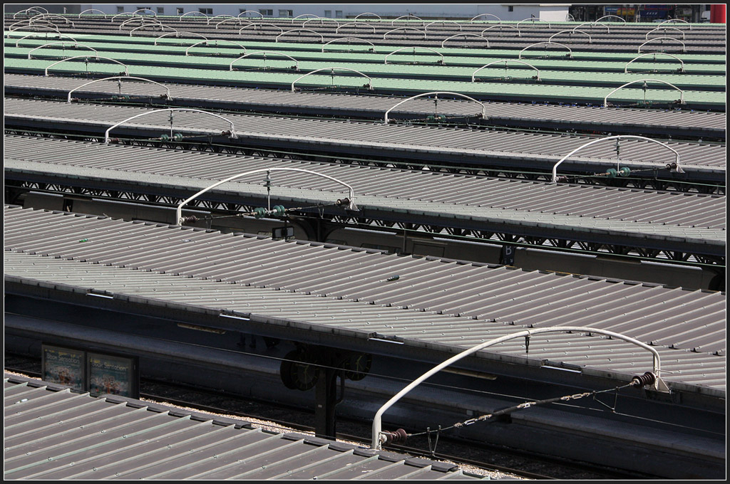 Kein Masten sondern Bögen - Oberleitungsaufhängungen zwischen den Bahnsteigdächern von Gare de l'Est in Paris. 17.07.2012 (M)
