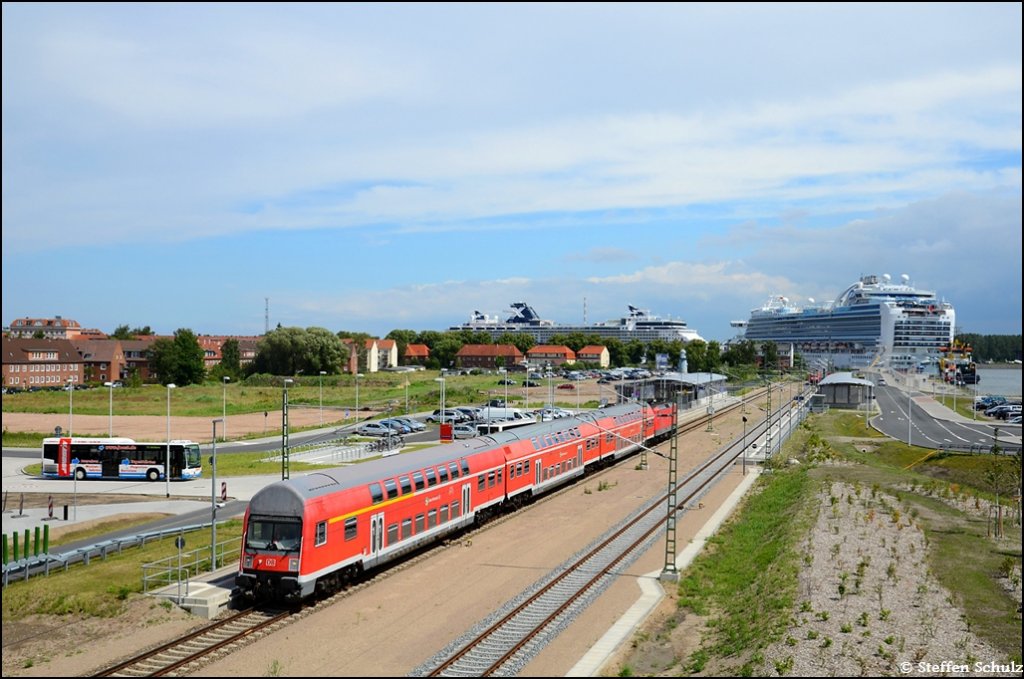S-Bahn am 09.07.12 am neugestalteten Hp Warnemünde Werft. Im Hintergrund sieht man rechts die Emerald Princess und links die Celebrity Constellation.