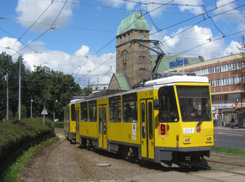 Szczecin, Plac Zwycięstwa: Tram 217 auf der Linie 9 nach Głębokie unterwegs. 22.7.2012