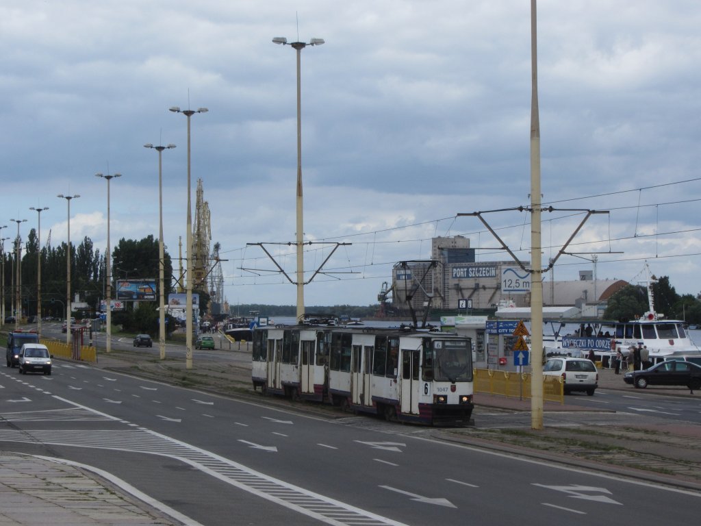 Tram 1047 auf der Linie 6 in der Jana z Kolna unterwegs, 21.7.2012. Im Hintergrund zu sehen sind Anlagen des Stettiner Hafens.