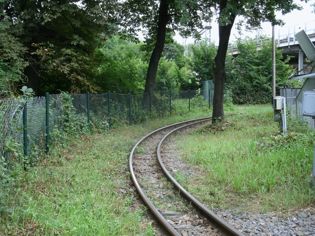 Verdammt knapp führt das Streckengleis zum Bahnhof Berlin Wuhlheide Parkeisenbahn an einem Baum vorbei.Aufnahme vom 14.Juli 2012.