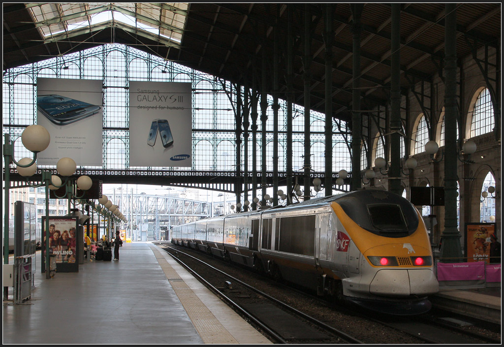 Ein TMST Eurostar-Triebzug verlässt den Gare du Nord in Paris in Richtung Lille.