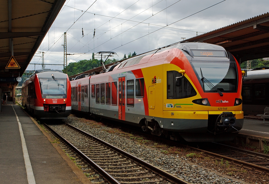 Ein 5-teiliger Flirt 429 046 / 546 der HLB (Hessischen Landesbahn) als RE 99 (Main-Sieg-Express) Frankfurt - Gießen - Siegen ist am 21.07.2012 in den Hbf Siegen eingefahren, links steht 648 206 / 506 (LINT 41) der 3-Länder-Bahn (DB Regio) steht als RB 93 (Rothaarbahn) zur Abfahrt nach Bad Berleburg bereit.