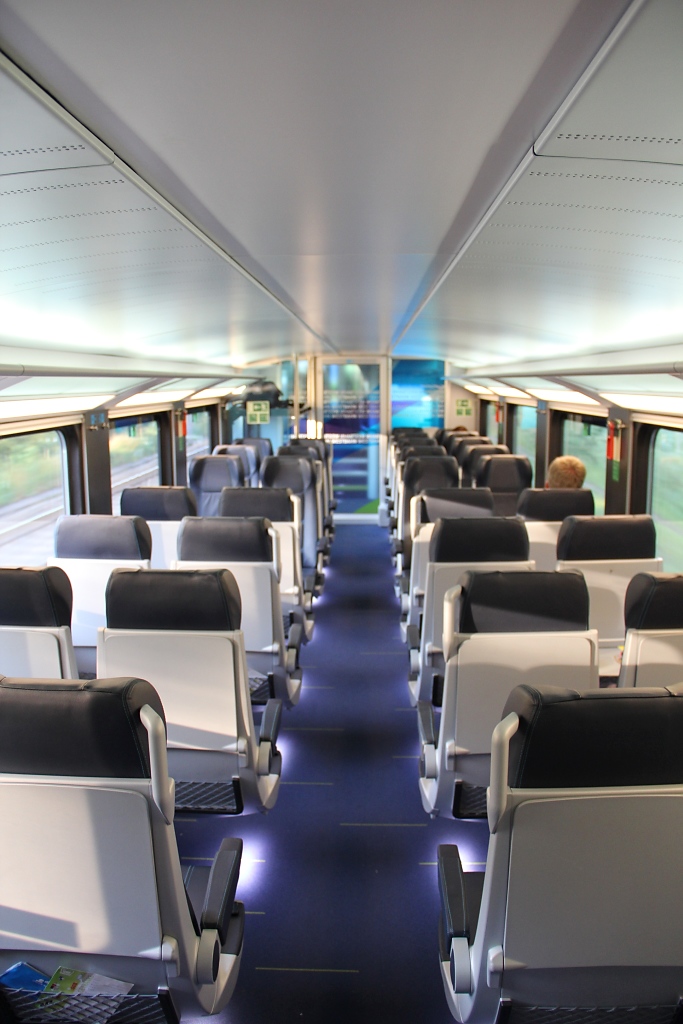 Ein Blick durch das unterste Stockwerk des KISS Triebzuges der Westbahn. An jedem Platz gibt es Klapptische und Gepäcknetze. Der Zug ist komplett mit Teppich ausgelegt. Nette Idee: die indirekte Gang-Beleuchtung aus den Sitzen heraus. Aufgenommen am 05.07.2012.