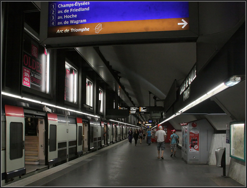 In der RER-Station "Charles-de-Gaulle-Étoile" hängen über den Bahnsteigkanten beleuchtete Werbevitrinen, die den Charakter der Station hier ausmachen. Die tiefliegende Haltestelle wurde bergmännisch gebaut, erkennbar an der Gewölbeform. Darüber liegen die Station dreier Metrolinien.