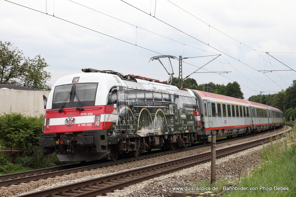 1216 020 (ÖBB - 175 Jahre Eisenbahn für Österreich) fährt am 20. Juli 2012 um 14:18 Uhr mit einem Eurocity durch Großkarolinenfeld