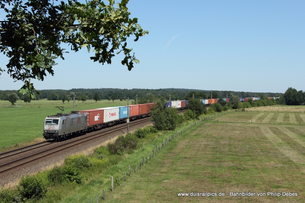 185 531-1 (TX Logistik) fährt am 24. Juli 2012 um 13:34 Uhr mit einem Güterzug durch Ramelsloh