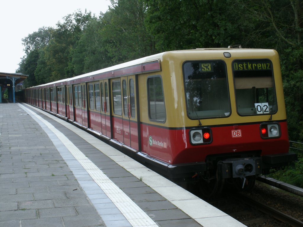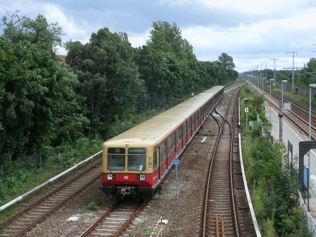 485 050 hielt,am 14.Juli 2012,an der ungewohnt menschenleeren Station Berlin Wuhlheide.