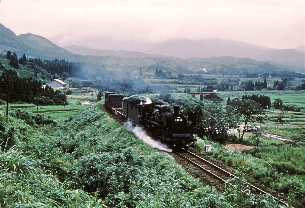 C55 52 mit einem Güterzug bei Tano im Süden der Insel Kyûshû, 12.August 1972. Diese schöne Expresslok wurde im Dezember 1937 gebaut und verbrachte den grössten Teil ihres aktiven Lebens auf der Südinsel Kyûshû bis zur Ausmusterung im Januar 1975 nach rund 3 400 000 Kilometern. Heute ist die Lok in Yoshimatsu erhalten.