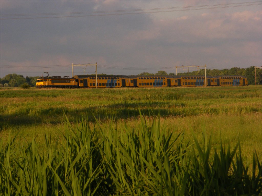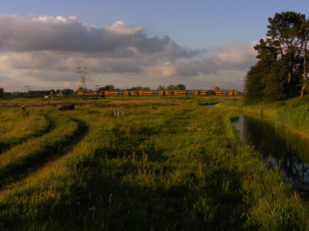 Doppelstockgarnitur mit 1713 fahrt dem Naardermeer Naturgebiet ein richtung Naarden-Bussum als Sprinter nach Utrecht CS am Abend des 18.6.12