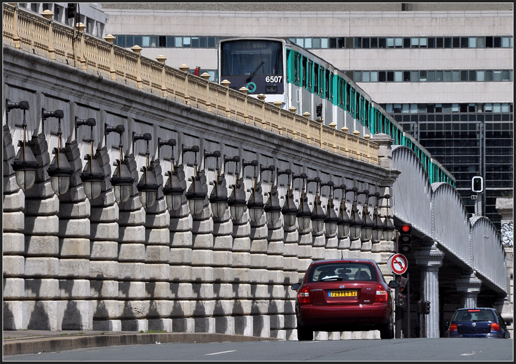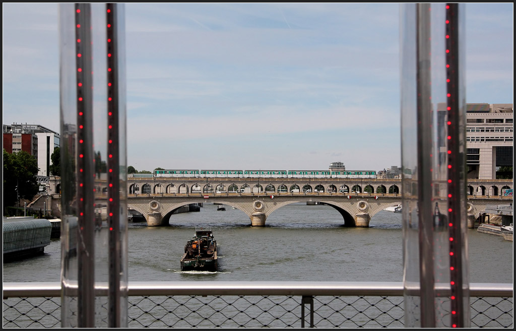 Die Metro fährt auf der oberen Ebene über die Pont de Bercy. Dieser Abschnitt der Metrolinie 6 wurde am 01.03.1909 eröffnet. Standpunkt war die Pont Simone de Beauvoir.