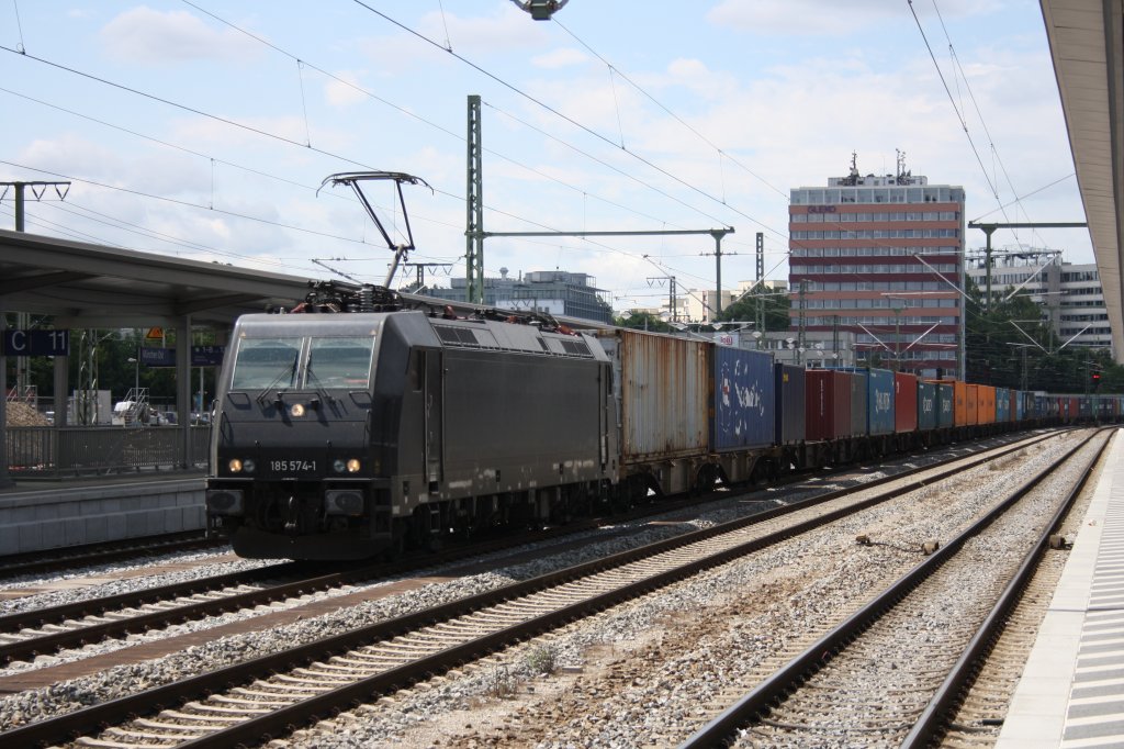 Ein sonntäglicher Güterzug in München Ost auf Durchfahrt mit 185 574-1 am 08.07.2012