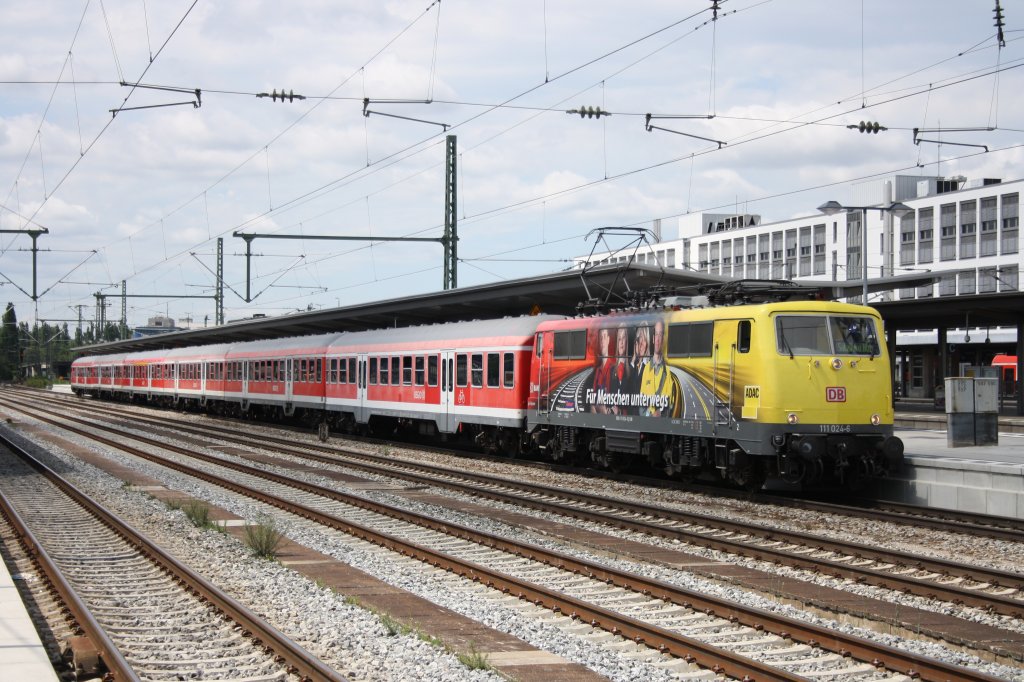 Am 26 Juli 2012 steht die Werbelok der DB, 111 024 'ADAC' in München Hbf mit ein Regionalzug nach Garmisch Partenkirschen.