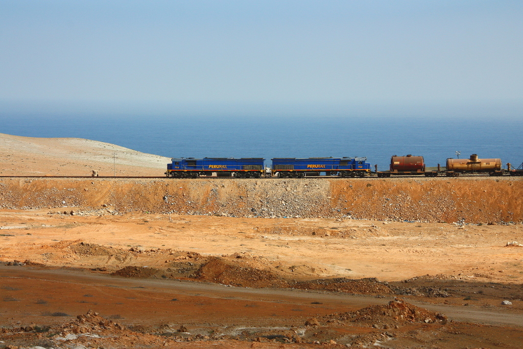 PeruRail - Der Zug, geführt von EMD G26C #752 & #756, mit leeren Tankwaggons für Mineralölprodukte verlässt das Gleisdreieck oberhalb von Matarani, und befährt jetzt die Strecke nach Mollendo, wo die Verladeanlage ist. 30.08.2011