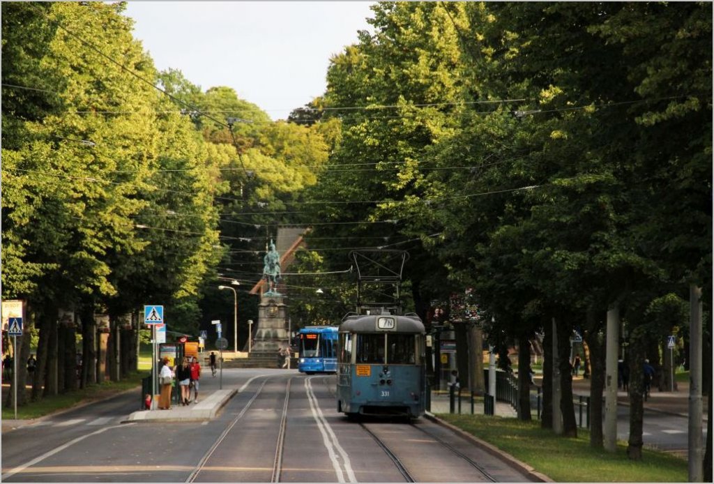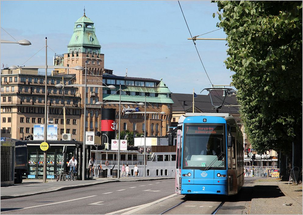 Schüchtern blickt die neue Fahrzeuggeneration hinter ihrer altehrwürdigen Vorgängerin hervor - Straßenbahn Djurgardslinjen, welche sowohl im Museumsbetrieb (Linie 7N) als auch im Planverkehr (Linie 7) betrieben wird. 27.7.12
