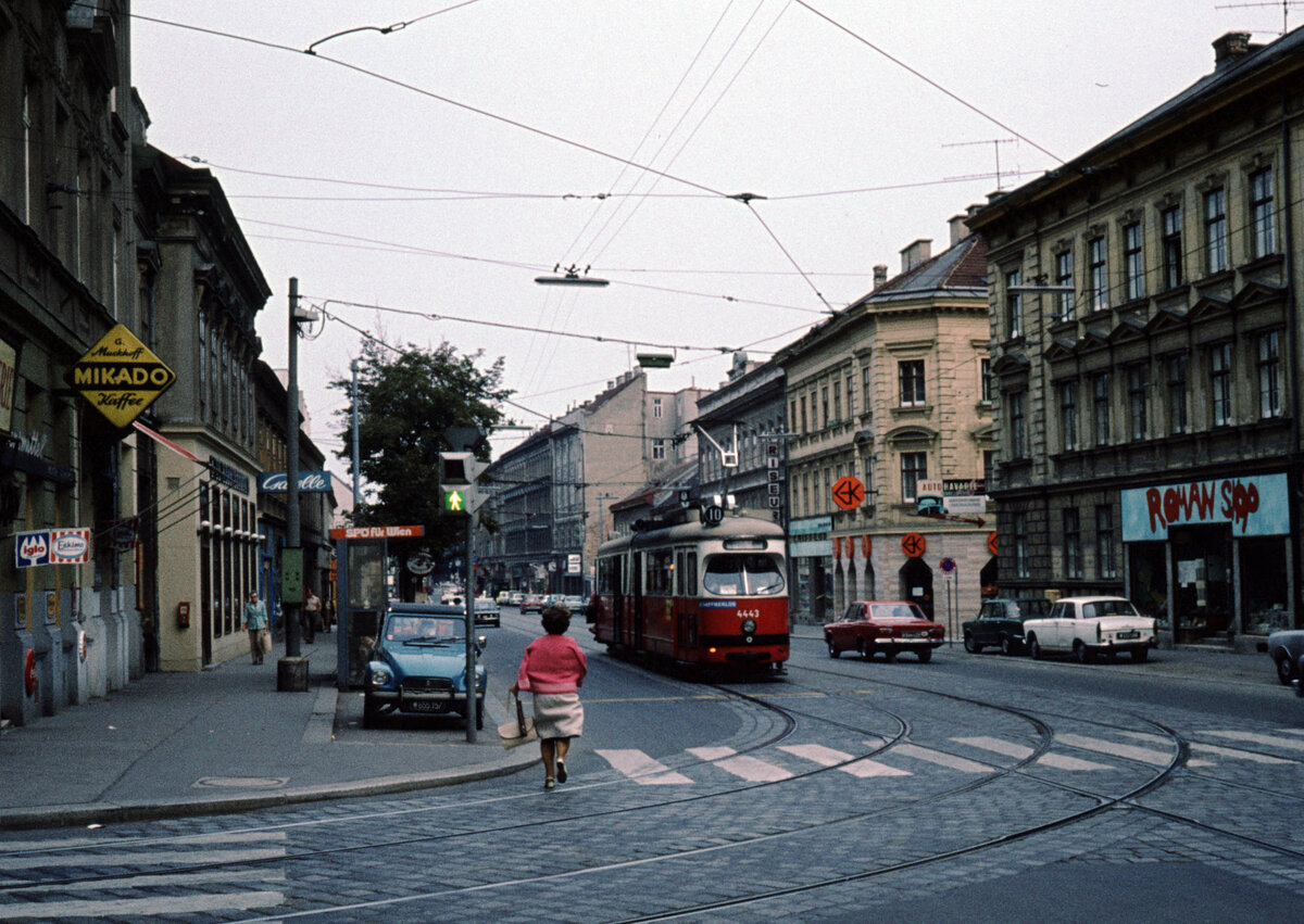Wien Wiener Stadtwerke-Verkehrsbetriebe (WVB) SL 10 (E 4443 (Lohnerwerke 1964)) XIV, Penzing, Linzer Straße / Reinlgasse im Juli 1977. - Scan eines Diapositivs. Kamera: Leica CL.