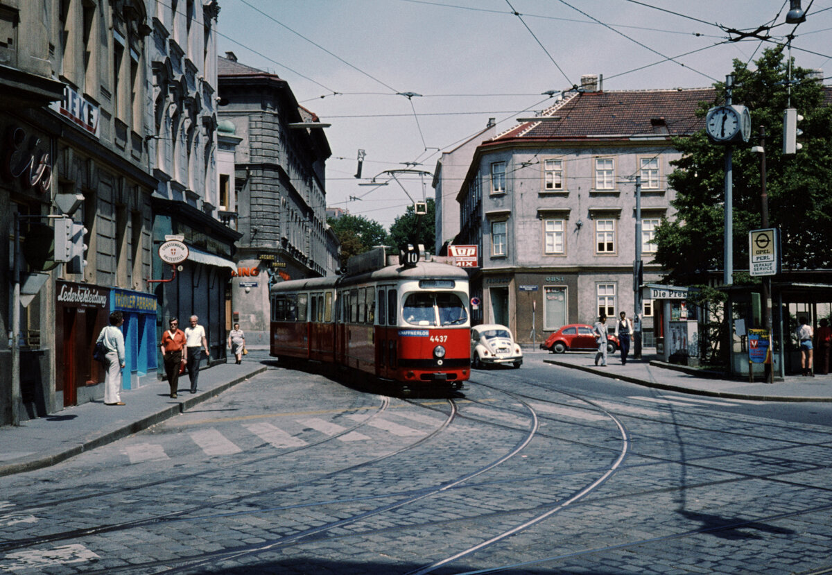 Wien Wiener Stadtwerke-Verkehsrbetriebe (WVB) SL 10 (E 4437 (Lohnerwerke 1963)) XIV, Penzing, Breitensee, Hütteldorfer Straße / Breitenseer Straße im Juli 1977. - Scan eines Diapositivs. Kamera: Leica CL.