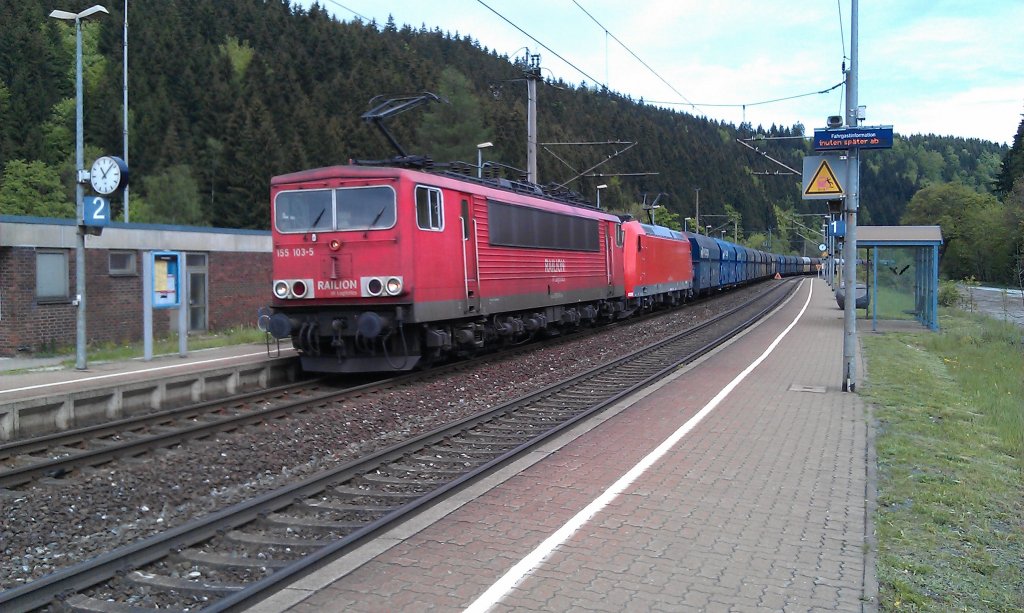 185 059-3 rangiert am 1. Juni 2012 mit einem gemischten Güterzug in Kronach von Gleis 3 auf Gleis 5, um einen schadhaften Kesselwagen auszusetzen.